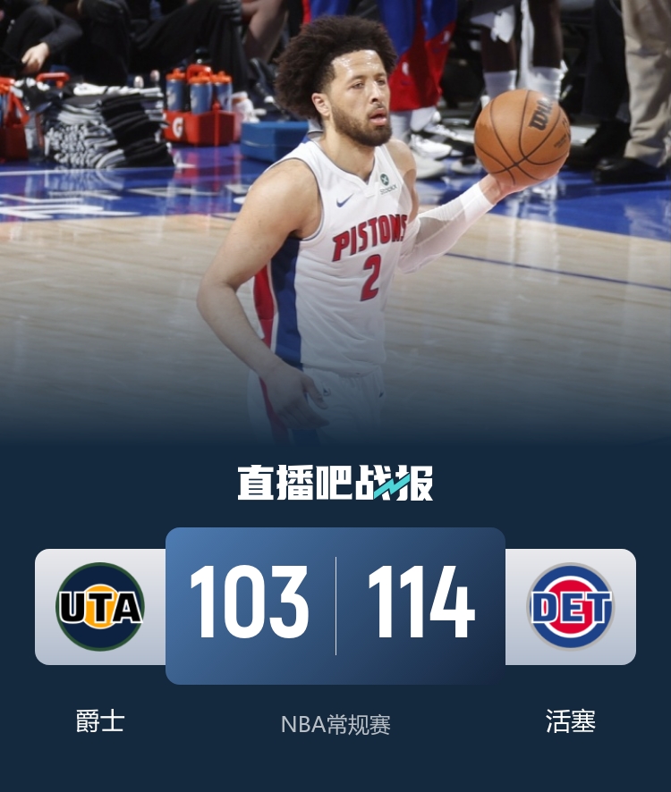 比賽開始后活塞搶占先機,隨后米哈伊柳克連中四球單人打出攻勢幫助爵士反超比分,活塞依靠內線雙塔穩住局面。第二節爵士在馬爾卡寧的帶領下率先打出攻勢取得領先,第二節后半段杜倫在內線爆發幫助活塞縮小分差。易邊再戰,活塞延續攻勢一舉完成反超,爵士在進攻端命中率下降,并且失誤增多。最后一節爵士上來掀起反撲一度追到3分,但隨后他們啞火,康寧漢姆連續拿分幫助活塞將分差拉大到兩位數,爵士無力縮小分差,最終活塞114-103擊敗爵士取得4連勝。