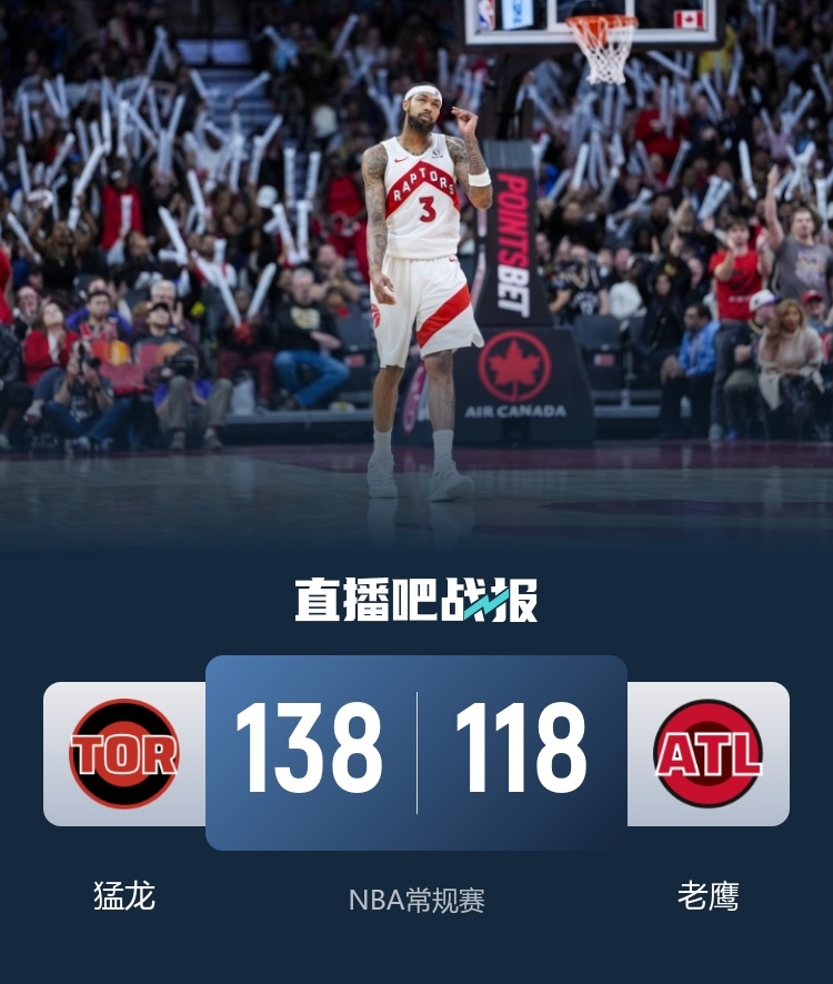 首節對決雙方手感非常不錯交替拿分且單節均砍下34+得分,猛龍率先發力一度拿到10分領先,但老鷹最后時刻連續飚進4記三分追至2分;次節猛龍以一波6-0開局稍稍拉開優勢逐漸控制局勢,節中一度拉開到12分,不過老鷹及時回暖止住頹勢并追至6分進入下半場。休息歸來雙方比拼進攻都無法阻止對手,不過后半段老鷹熄火直接導致崩盤,猛龍抓住機會送上一波18-2的攻勢直接拉開23分的優勢,這一節猛龍狂轟45分。末節猛龍牢守大比分領先沒有給對手任何機會,最終,猛龍客場大勝老鷹迎來開門紅。